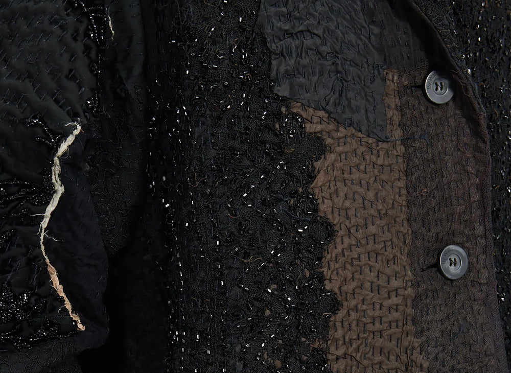 The start of the Romantic movement in the late Victorian age brought in a sophisticated palette of poetically moody black and inky shades. This collection of 19th century Victorian and Edwardian textiles comprises panels of plush silk and velvet – a fabric that encapsulates the era's pursuit of aesthetic richness. Renewed into hand-stitched patchworks at our studio in London, focus is drawn to fanciful embellishments such as Venetian glass buttons sourced from Murano and faceted jet beading, reflecting the affinity for intricate detailing and elevated textures during this period.